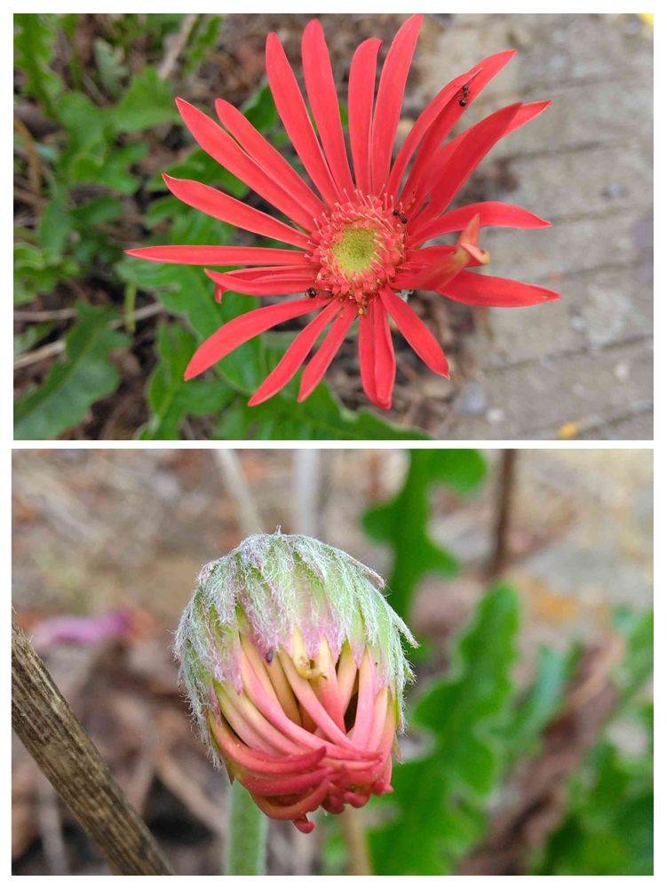南アフリカ原産で、赤色で花弁が細く、枚数が少ない。