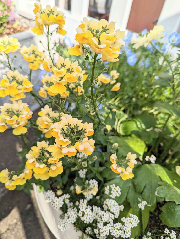 ネメシア、ネモフィラ、フッチンシア、ラナンキュラスラックスの寄植え。(ラナンキュラス写ってないけど💦)
