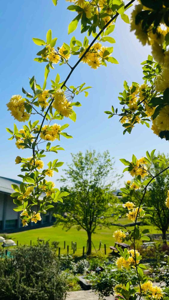 青空に透けて見えるモッコウバラ素敵ですね(´∀`).☆.。.:*・゚