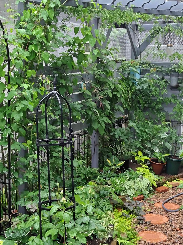 パーゴラの上の方はつるバラのドロシーパーキンスみたいです😅