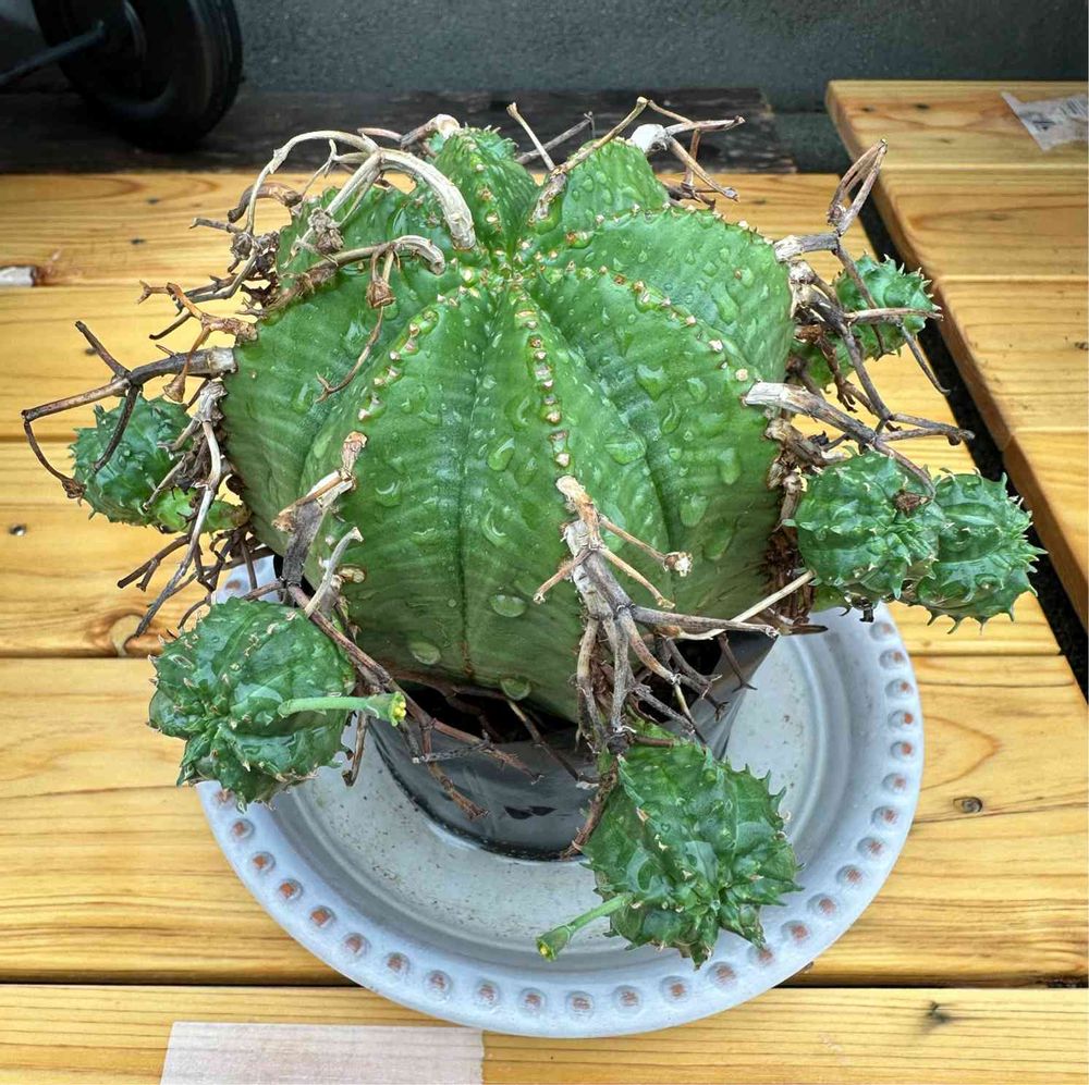 鉢から抜けなくて困っていたので、冬の間断水して痩せて来た頃引っ張って抜けました。昨夜からたっぷり雨水に浴びてイキイキ。