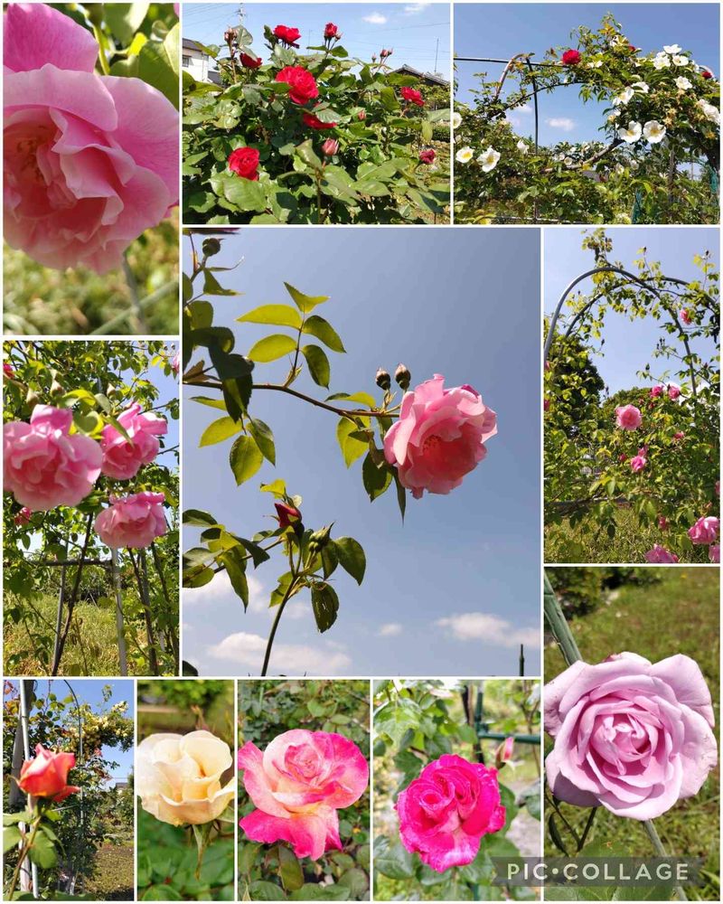 こんにちは🤗🌞2枚です😊午後からのお多福ガ―デンの薔薇です。4月21日picした、ガ―デン仲間が育ててくれ、ガ―デンで見事に沢山の蕾をつけてたのが今日一斉に花開いた💗の薔薇スパニッシュビューティーです💗他にも、ブルーム―ン💜薔薇も綺麗に咲いて他の薔薇❤️🩷🧡🤍賑やかになってます。青空になってくれて太陽☀さん、ありがとうございました🌞⤴️✨。つづく😊。