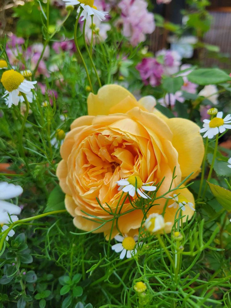 昨日からの雨が今朝上がり花が重たくてカモミールに乗っかってます