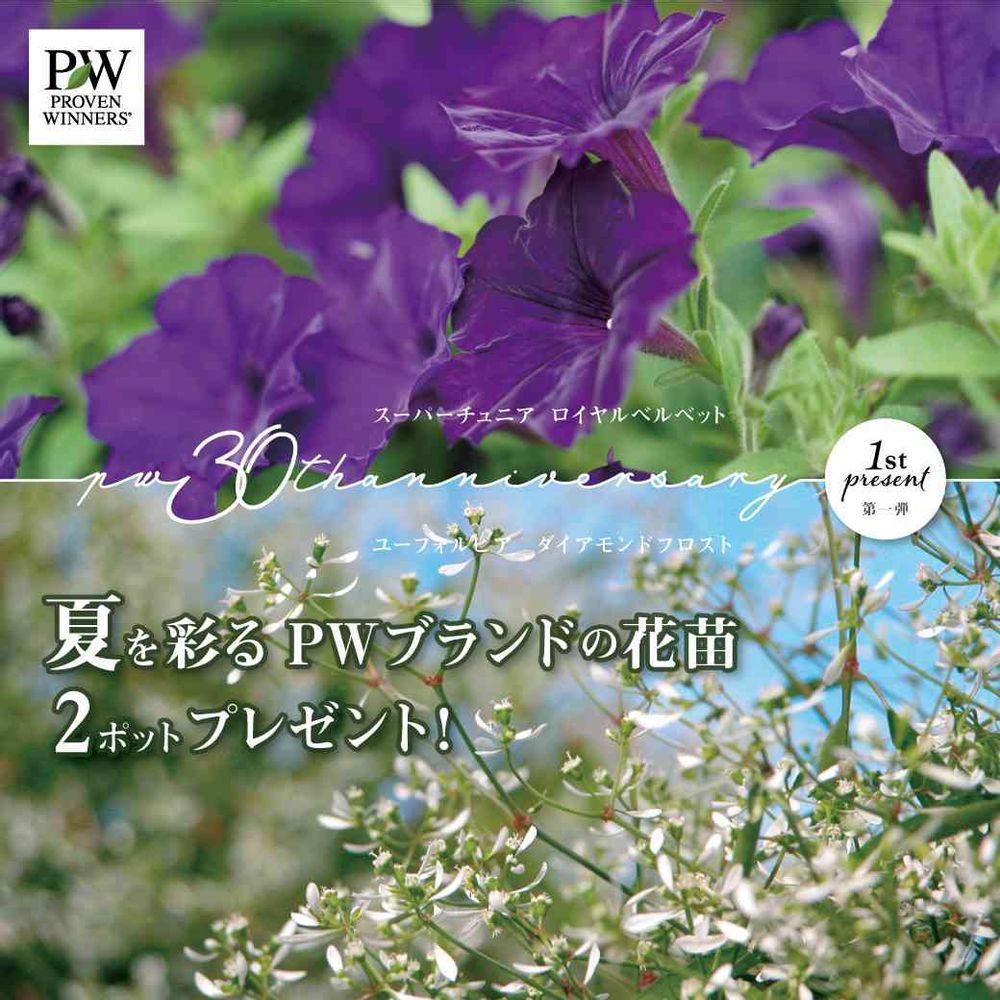 今回は、日頃の皆さまへの感謝の気持ちを込めて、PWが胸を張っておすすめする「スーパーチュニア ロイヤルベルベット」と「ユーフォルビア ダイアモンドスノー」をセットで抽選で60名様にプレゼントいたします。