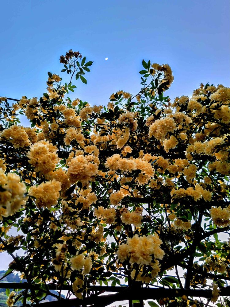キモッコウバラの最後の満開風景と共に、西の空に浮かぶ半月を楽しんだ。