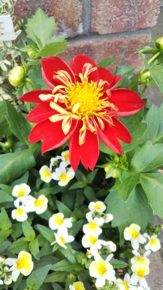 ホームセンターで、珍しいダリアを見つけて寄せ植えてみました。