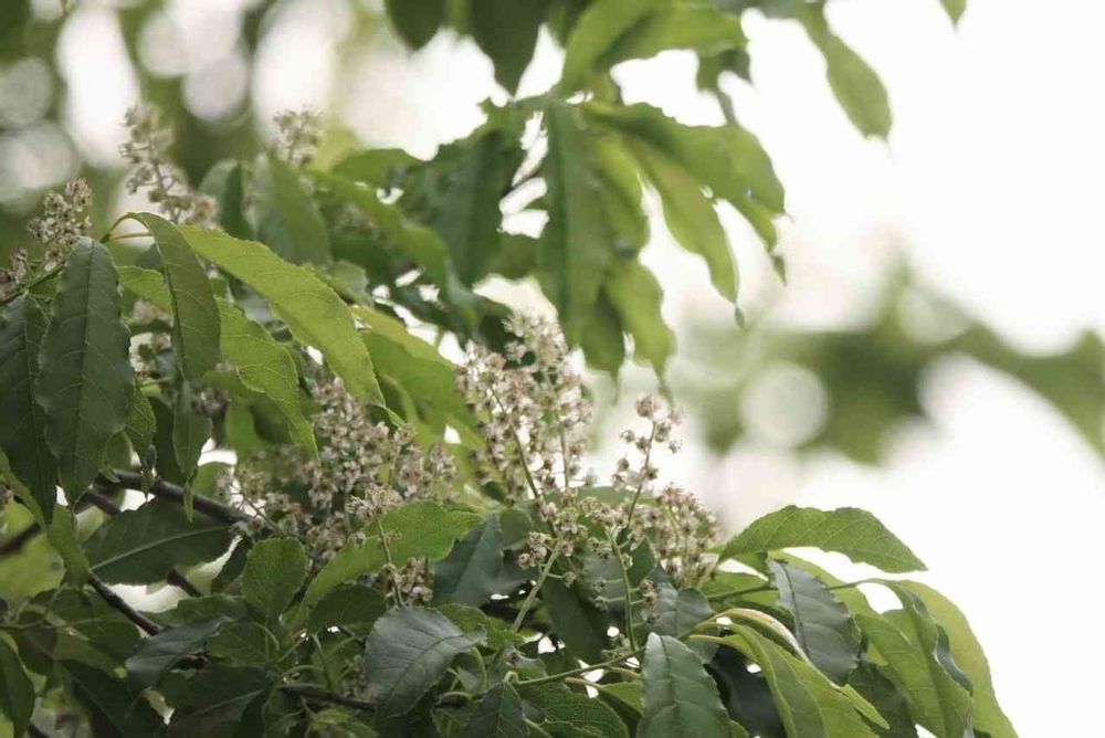 道路際の大木、目立たない花が咲いています。イヌザクラ?