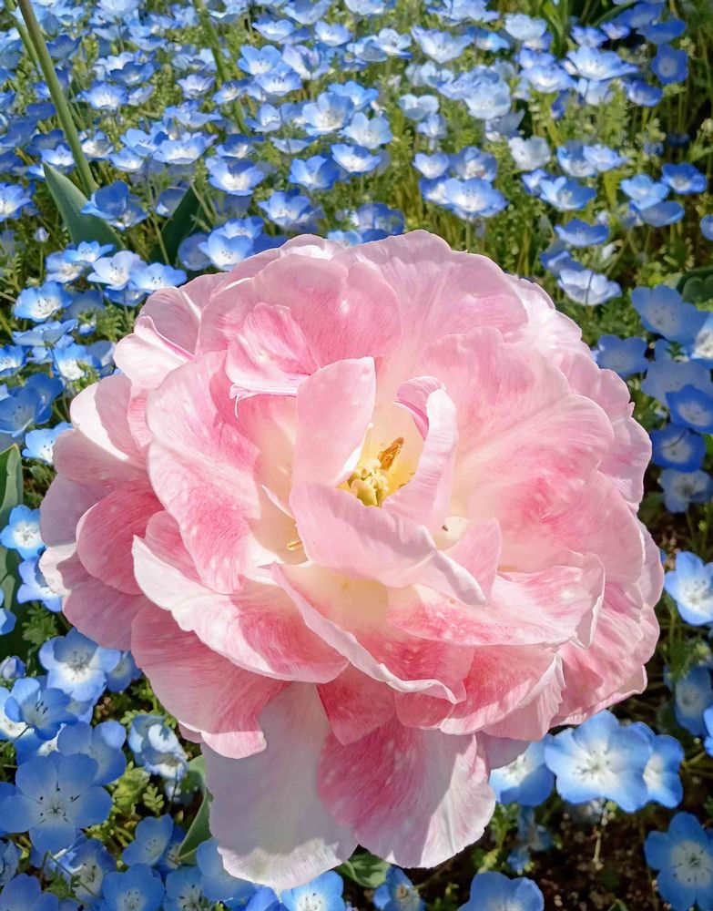 ネモフィラ畑にピンクのふわふわチューリップが、可愛いかったです🌸