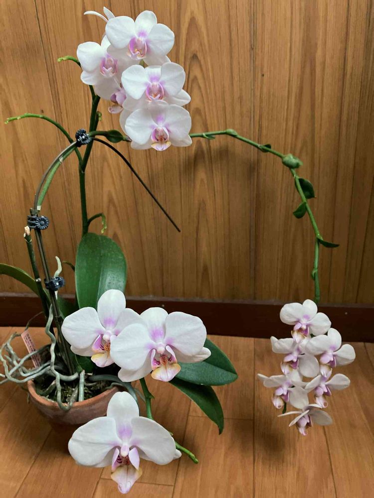 2番花を狙いカットした花茎が花が付かず思いのほかビヨーンと伸びてしまい、後から上がってきた花茎と共に蕾が付き、2月頃から開花し始めてこんなバランスで咲き続けているロングランです。しおれる前に記念撮影。
