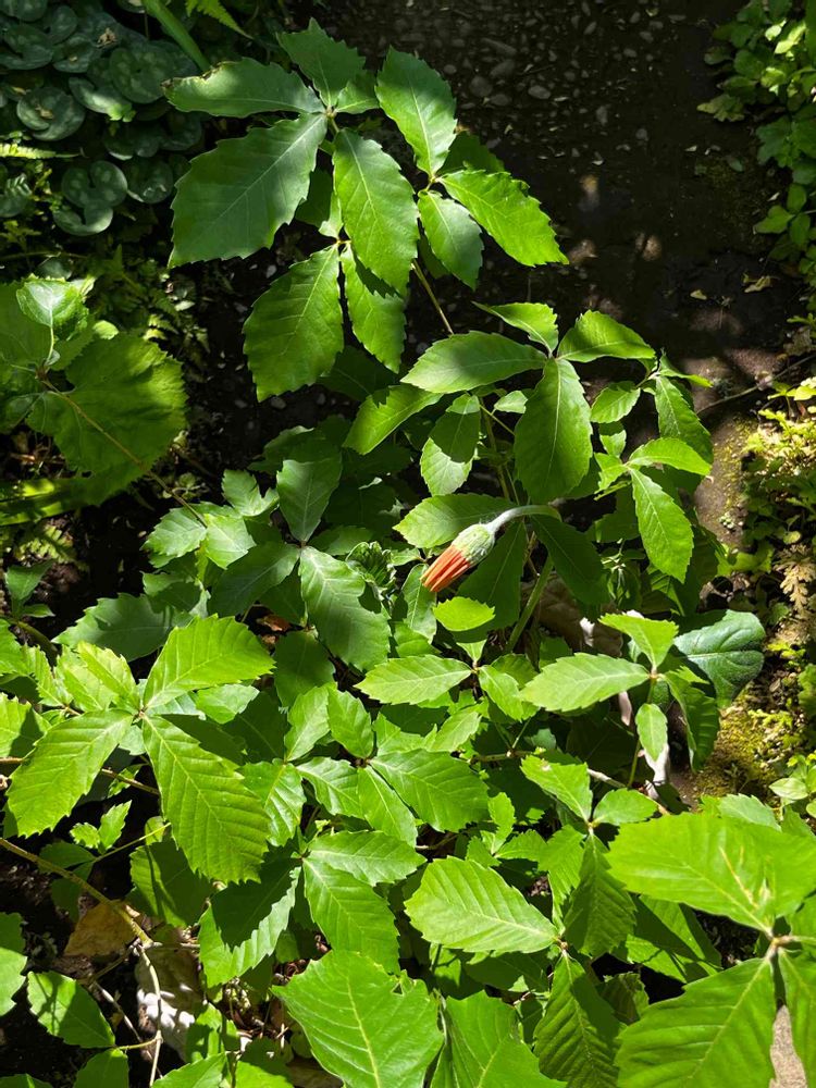 ドングリが発芽🌱🌱🌱した時から真ん中にガーベラらしき葉っぱが出ていました