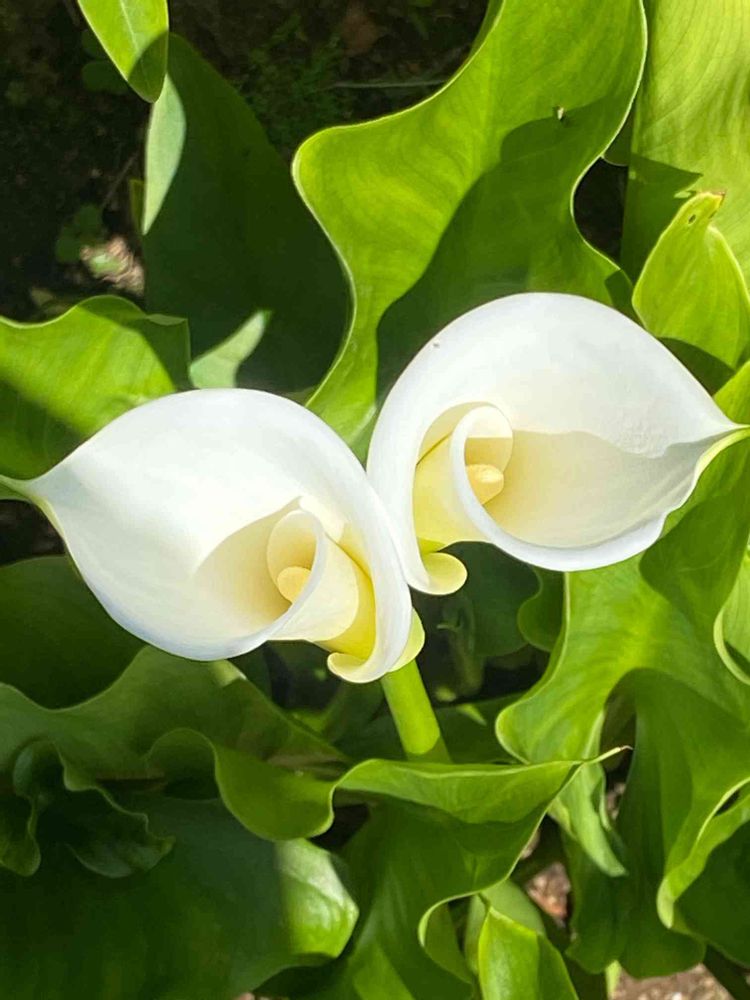 横にもう少し開いた1番花のカラーがありますが、こちらの2本のくるくる、風のいたずらでしょうか?