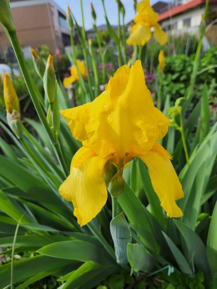 晴れた空に、ジャーマンアイリスの黄色が、鮮やかです。💛💛