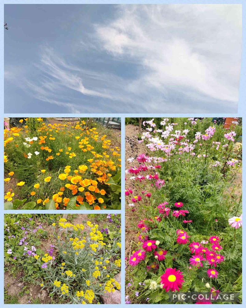 こんにちは🤗🌤️午後1時17分頃の空🈳です。下👇は、お多福ガ―デン仲間で私達が畑借りてるご主人の畑の花々です。🟡はハナビシ草←、下👇母子草、右👉は、赤花除虫菊ロビンソンミックス綺麗に咲いてますね~💕