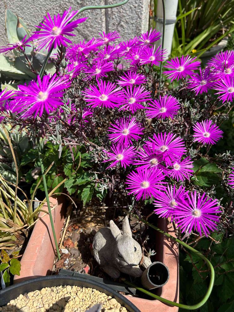 メセンの仲間のマツバギク。でも 夏場に水を遣っても枯れない丈夫な奴。元は庭の片隅にいた奴だが、プランターに勝手に侵入して勝手に毎年咲いてる。プランターはボロボロに半壊しているのだが、こいつのせいで片付けられないでいる。庭にいた元親は消えてしまった。