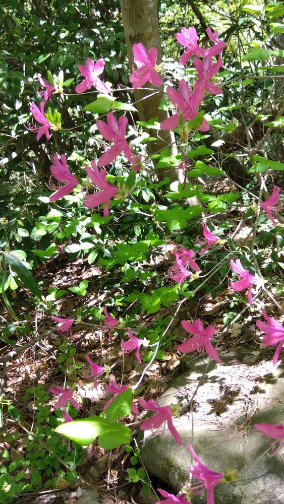 久しぶりの山登りで見つけたミツバツツジです。小さいけれどピンク色が周りの緑に生えてとてもきれいですよ。💗💗💗葉が三つ一緒についていることから三つ葉ツツジと言うそうです。🌿
