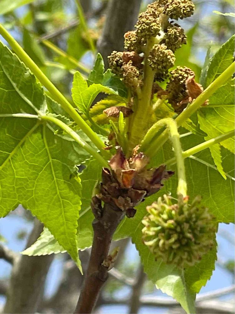 「モミジバフウ」正式名称は「アメリカフウ」。雌雄同株です。上が雄花で下が雌花ですね。秋になると、落ちている茶色の実をよく見かけますます。運動公園で、3月に撮りました。