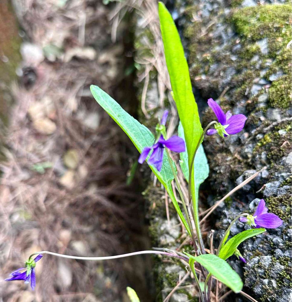 道路の側溝の隙間から顔を出してるのは「スミレ(本スミレ)」です。どこにでも出てきてこういうコンクリートの隙間とかからもよく顔を出してますね😆