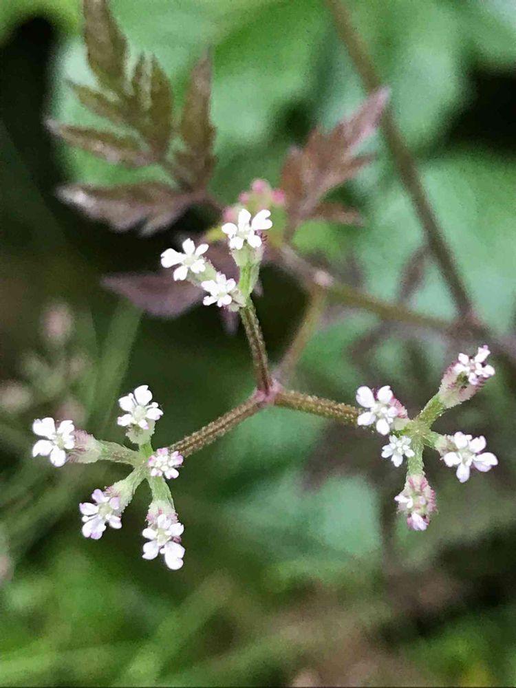 草叢。花の直径2mmほどです。茎と実に細かい棘?毛が生えています。この草の名前は?ヤブジラミと教えて頂きました。