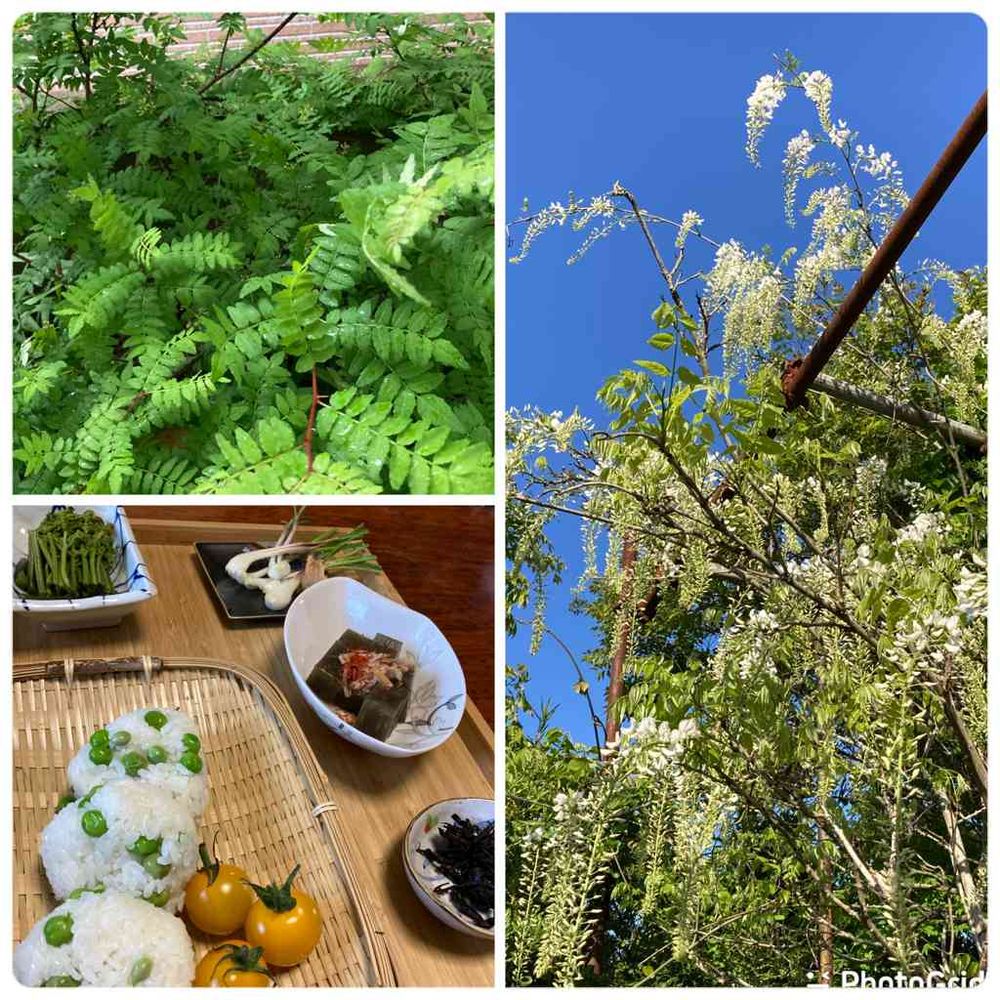 朝ごはんは、豆おにぎりとワラビ、海藻、葉唐辛子、エシャレット🌿