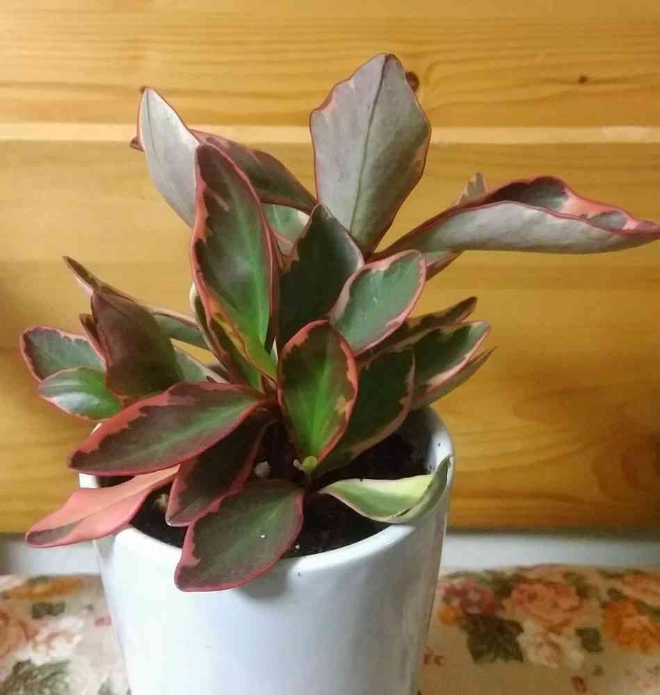 の斑入り品種で、緑色地に大きなクリーム色斑がは入り、やや赤みを帯び、周縁は紅色になるトリカラー。