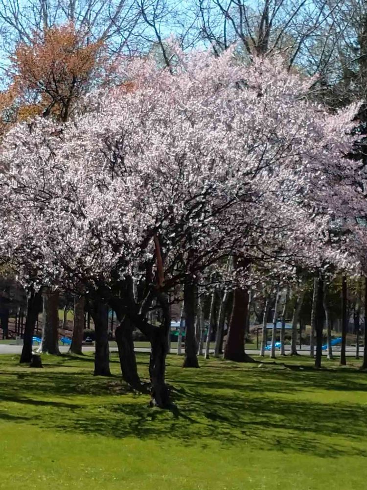 綺麗な芝生に映る幹や🌸が 絵になってますね