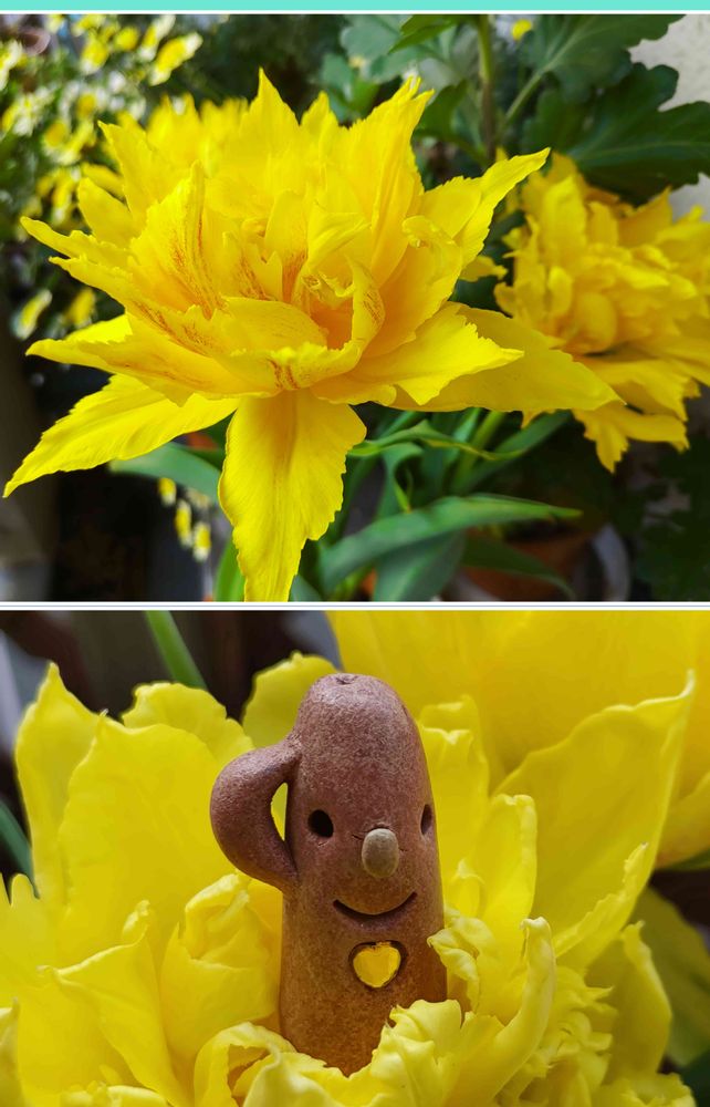 GSでも拝見したことのないチューリップ🌷珍しいこと❤️そしてなんとまあ桃太郎ならぬ花太郎のようなハニワくんも凛々しいこと♡