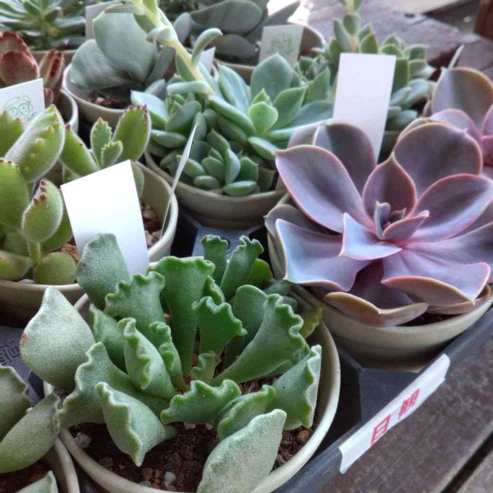 葉にフリルが入ってる多肉と薄ムラサキのような多肉。とてもきれいです