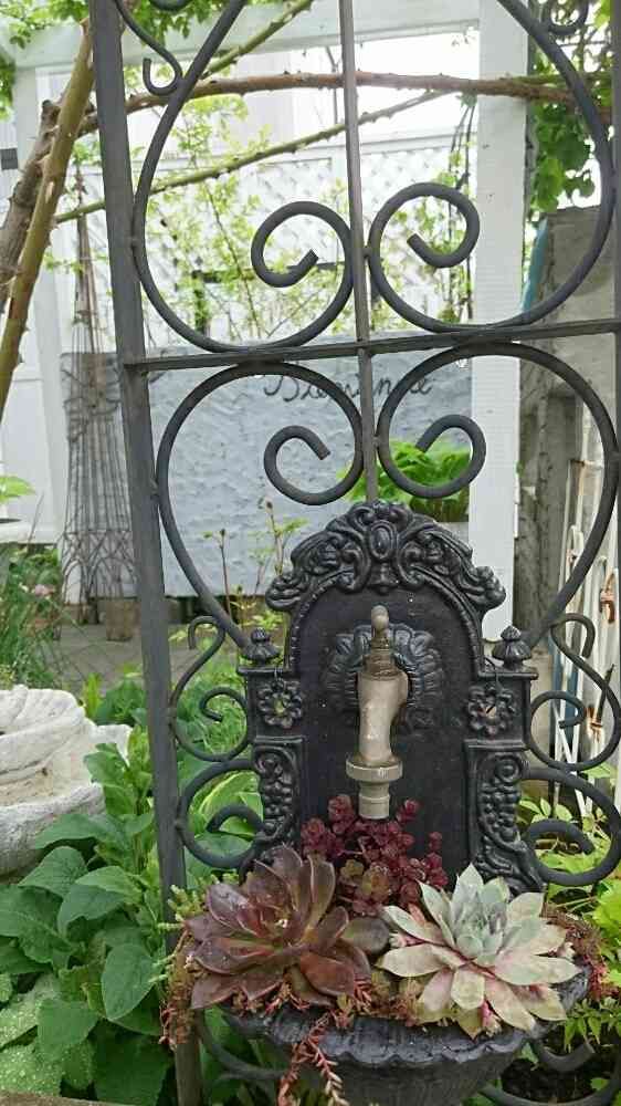 アイアンの水注栓にエケやセダムを植え込んでみました♪