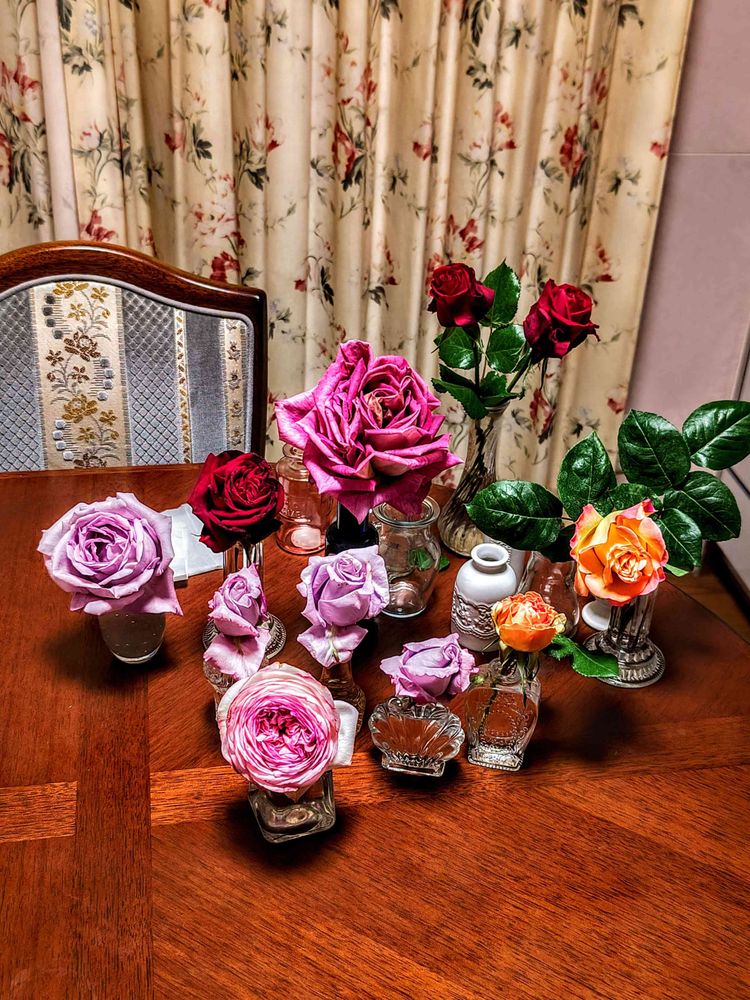 一昨日、花首だけを収穫するために、小さな花瓶を100均で20個ほど購入した。何千個と咲くのであるから、この机の上は、バラで埋め尽くされ、その他のバラは、ご近所さんに配ったり、我が家のローズガーデンに来られた人にお土産として無料で差し上げる。更に余るので、ドライフラワーにする。