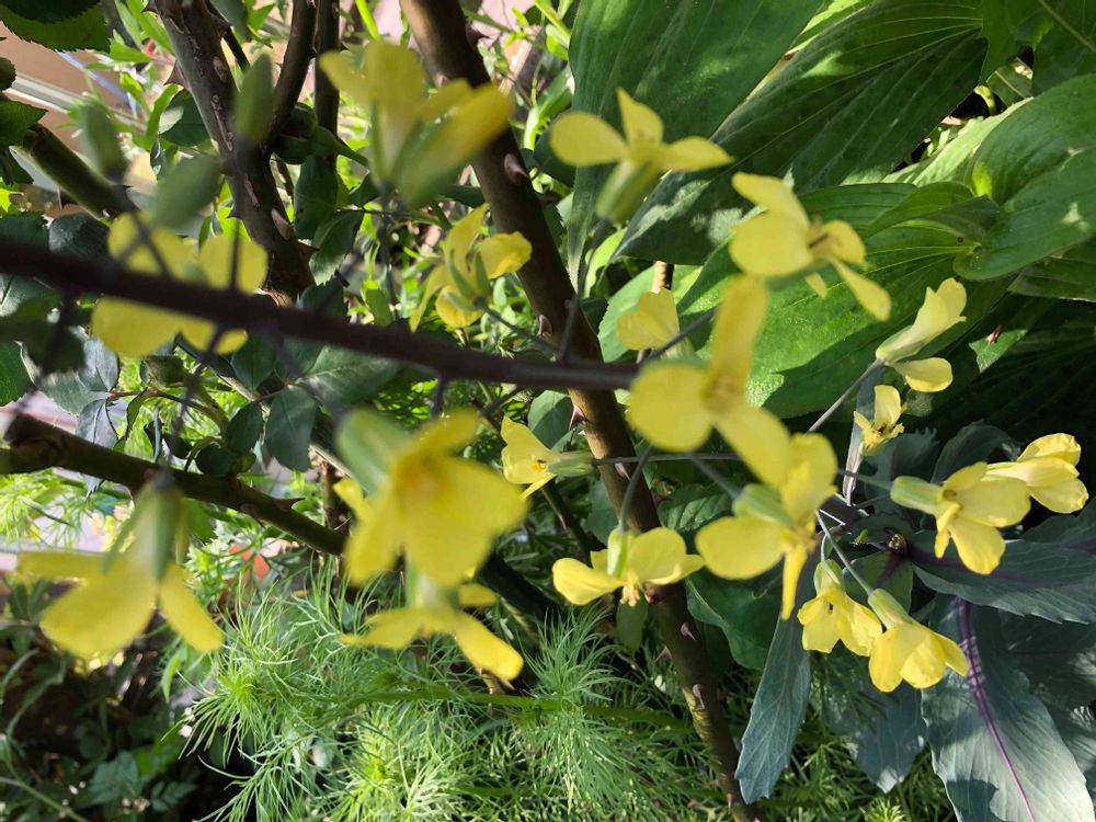 アブラナ科植物だけど花同士の間隔や花の色からしてキャベツの仲間ですね! 赤い茎と葉が見えるので葉牡丹かと思ったけど葉の形が細長いので赤キャベツの花‼️ 違うかな😅