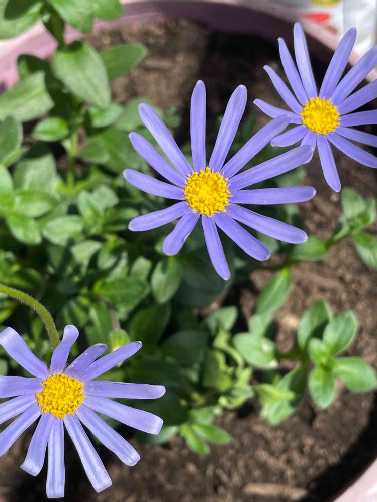 2023-4ー29(土)🌫️🍃☀️🌫️薄曇り 🍃強めの風があります やっぱりステキな真ん中黄色の青紫なブルーデイジー🪴 美しく青きドヨウ参加させて頂きます🙋♀️🙋🙋🏼♂️定植して花数が増えましたよー