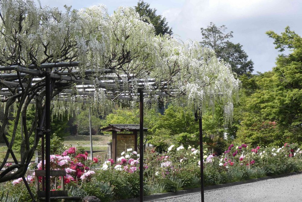 白い藤棚の下にも牡丹。