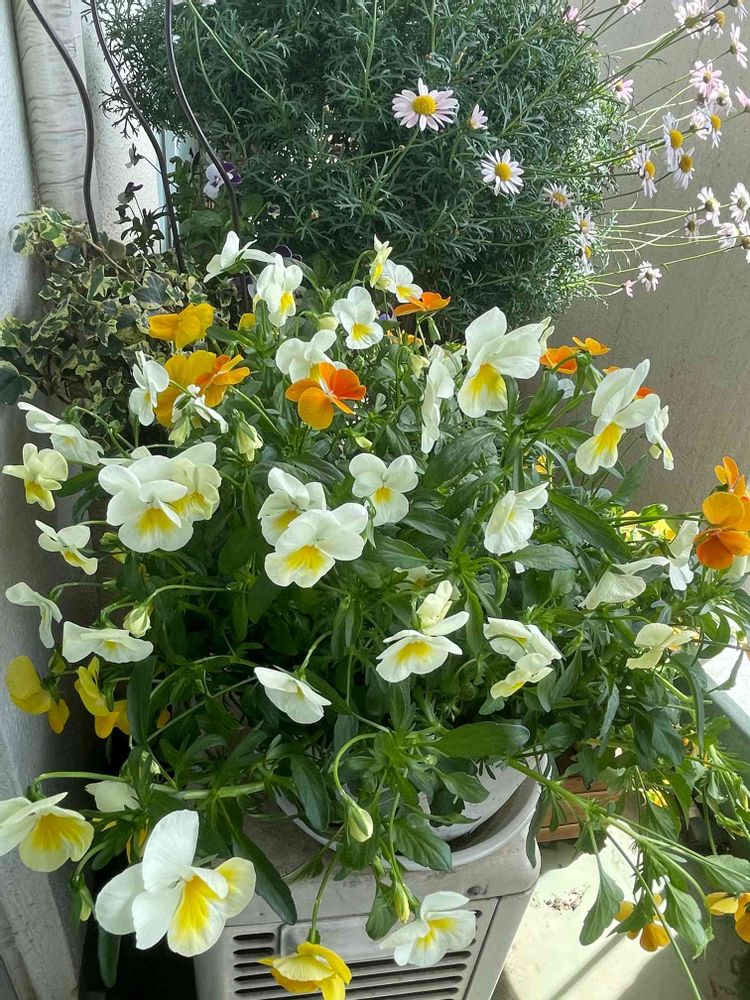 ずっと満開のビオラ3株の寄せ植え、背丈が伸びてきたのですが、、、今朝見ると見事にパッカーンと倒れてました😱💦