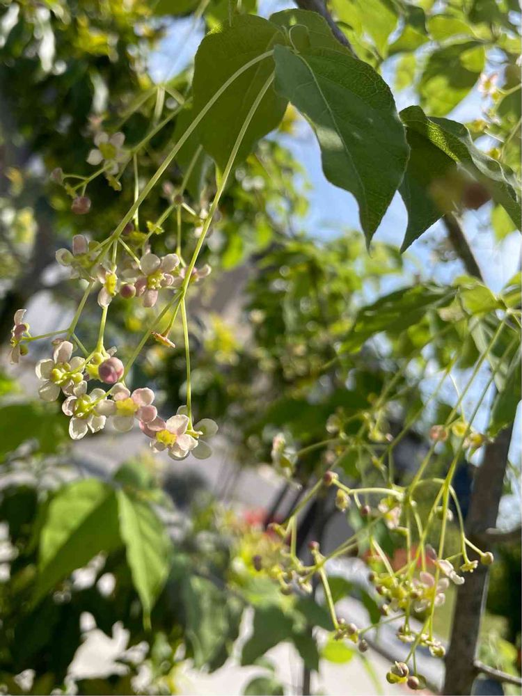 「片想い」が花言葉。枝から垂れ下がって小さな小花が咲きます。めしべが光って見えるのか、うるうると潤っているような花。風にそよぐ姿が軽やかで、不安定で、繊細な印象です。秋の紅葉🍁、赤い弾けたような実も綺麗で大好きな植物のひとつです🥰