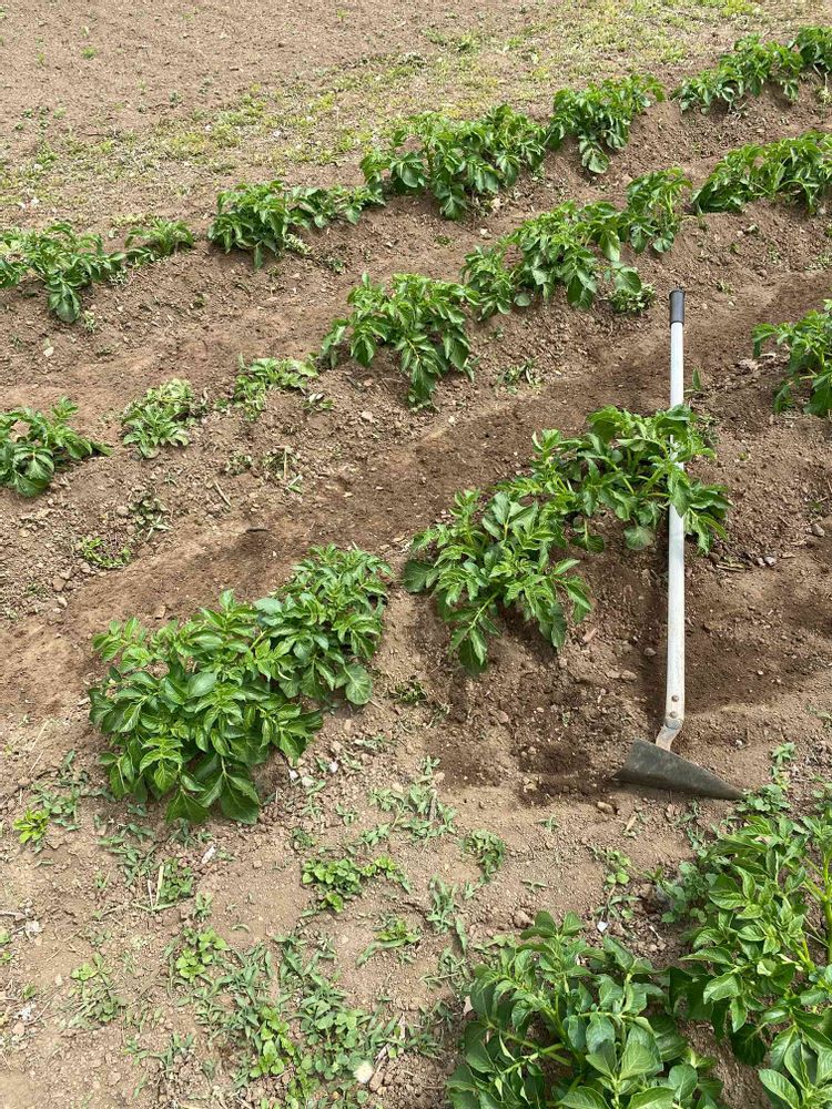 美味しい・良品質なじゃがいも🥔を育てる為に、🌱の間引き・2〜3本にして追肥 鶏糞を与えて雑草駆除を兼ねた土寄せをしました。