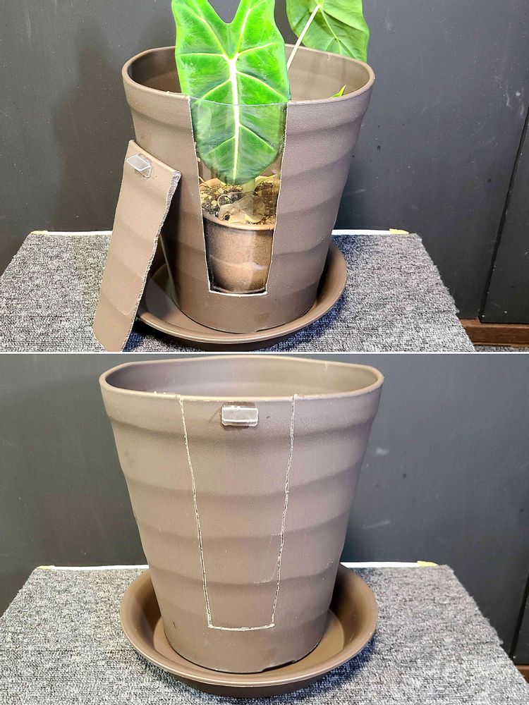 鉢を切り抜いて内側に透明なアクリルを貼って鉢内を覗けるようにしてみました。光が入らないようにスライド式のフタ付きです。