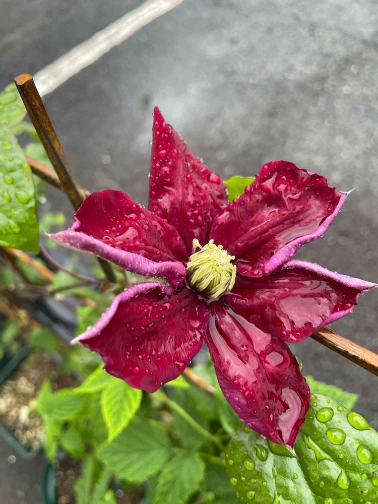 こんばんは♪クレマチスシャルメインが雨の中に1番花が開花してました😊思ってたより小ぶりなお花でした。