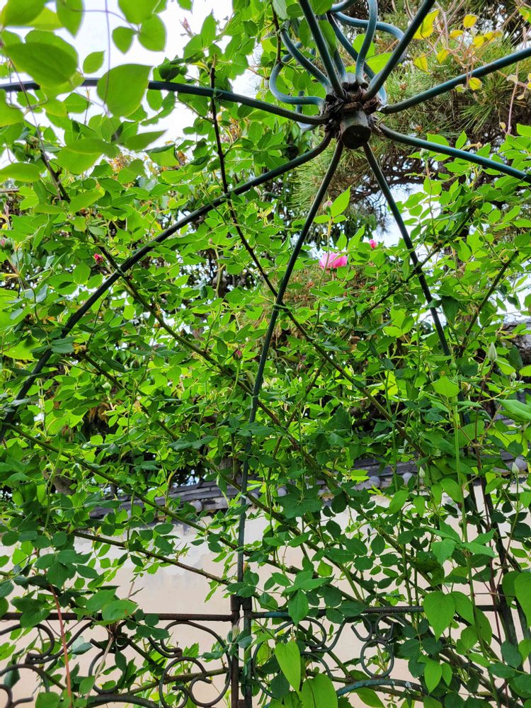ガゼボの上部にラレーヌビクトリアの1番花が咲きました
