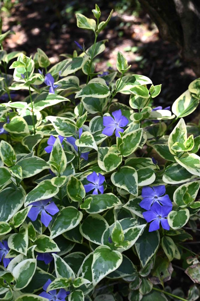 斑入りのツルニチニチソウが、木漏れ日を浴びて綺麗に咲いています💙🌿😍