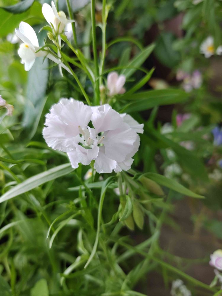 白い花 googleで調べたらたぶん ナデシコ です 花びらがふわふわしててものすごくかわいー♥です