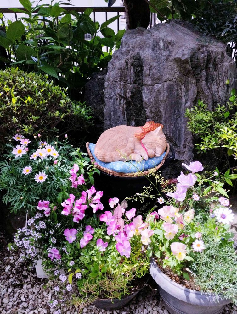 昨日4/29に愛猫を庭の枯山水の大きな石の前(猫の置物の下)に庭に咲いた薔薇の花を沢山入れてあげて埋葬しました。
