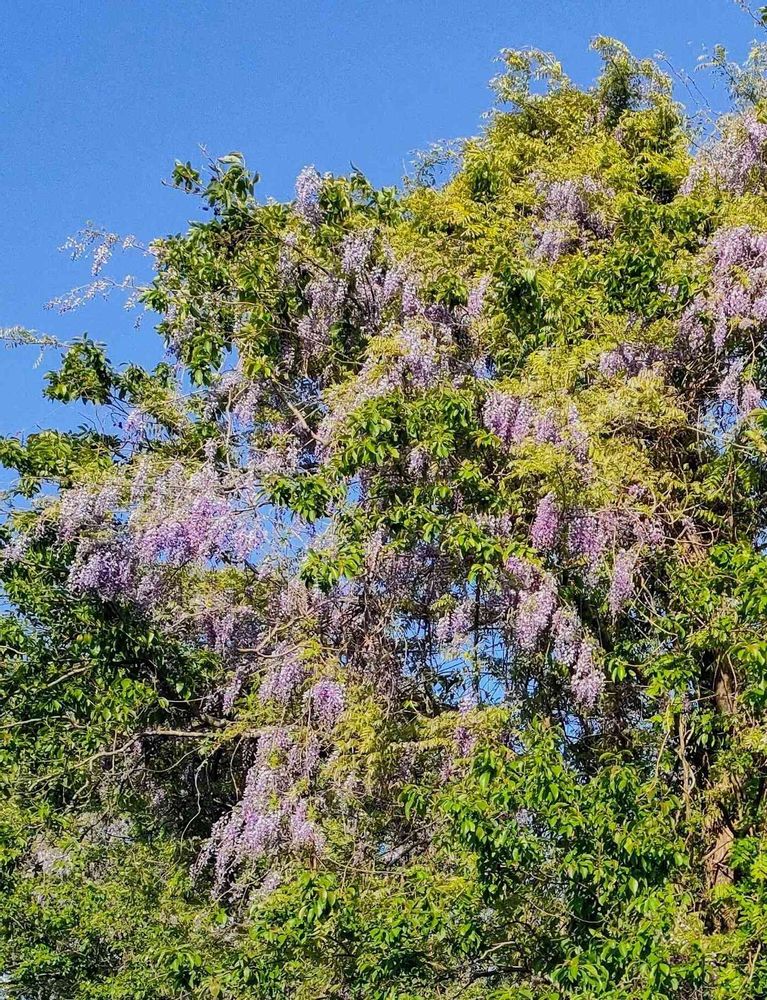 ヤマグワ(山桑)の木にヤマフジ(山藤)が架かっています。10m以上の高さを見上げて壮観です。