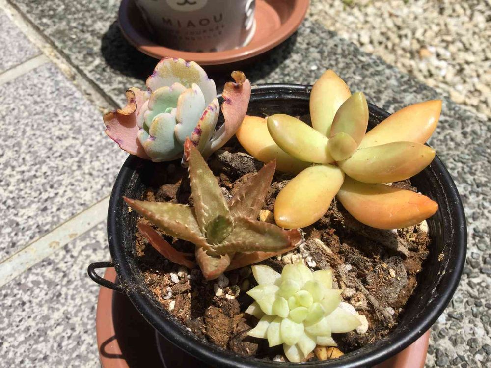 左上のちょっとピンクっぽい色の多肉植物さんの名前がわからないです(・・;)わかる方教えてください!