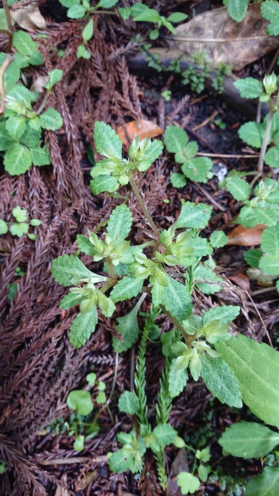 ヨゴレネコノメソウは、イワボタンの変種という位置づけらしい。どちらも、形はほとんど同じですが、イワボタンは、全体が緑色であまり褐色にならないとある。