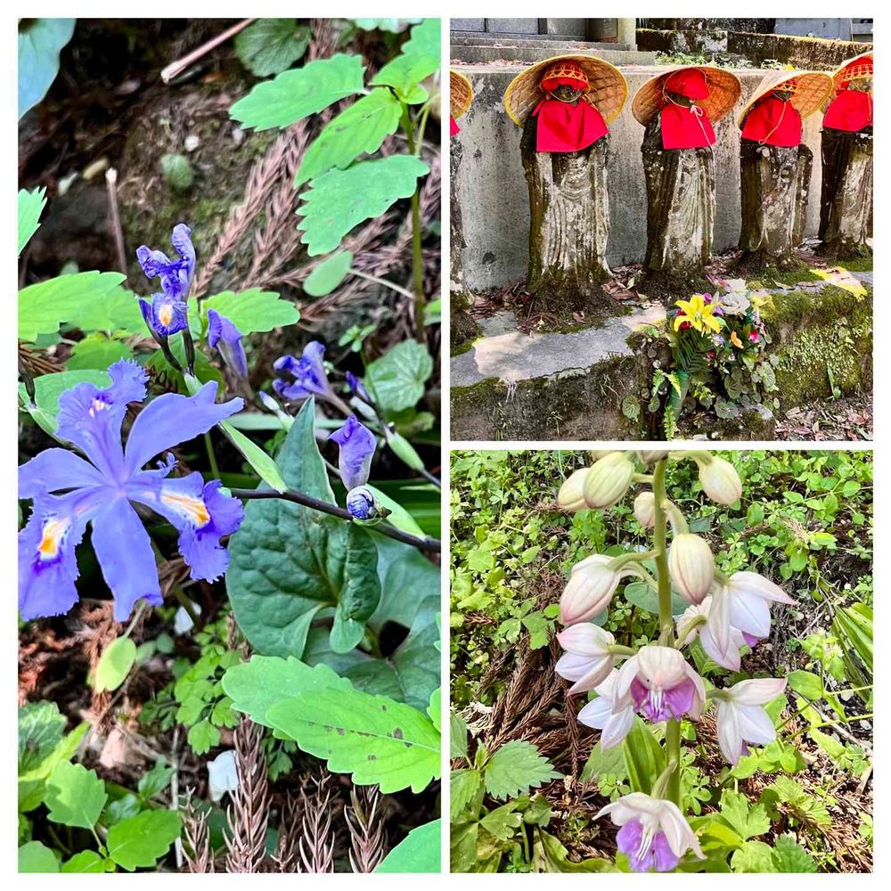 珍しい紫色のシャガ、大輪ピンクのエビネ蘭、六地蔵もありました。
