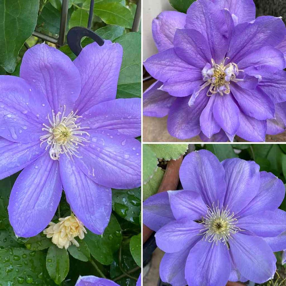 クレマチス ヤング。毎年ちゃんと咲いてくれます。去年までは左のようなシンプルなお花だったのが、今年は右のようになぜか八重咲きに🤗進化したヤングさんに毎日うっとり癒されてます😍
