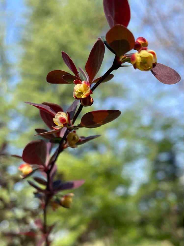 開花は3~5月。新芽の濃い赤紫の葉は、「銅色葉」と言うらしく、そこに黄色の花はよく似合う。花弁と萼が6枚ずつあり、萼が花弁より大きく花をやさしく包んでいる。
