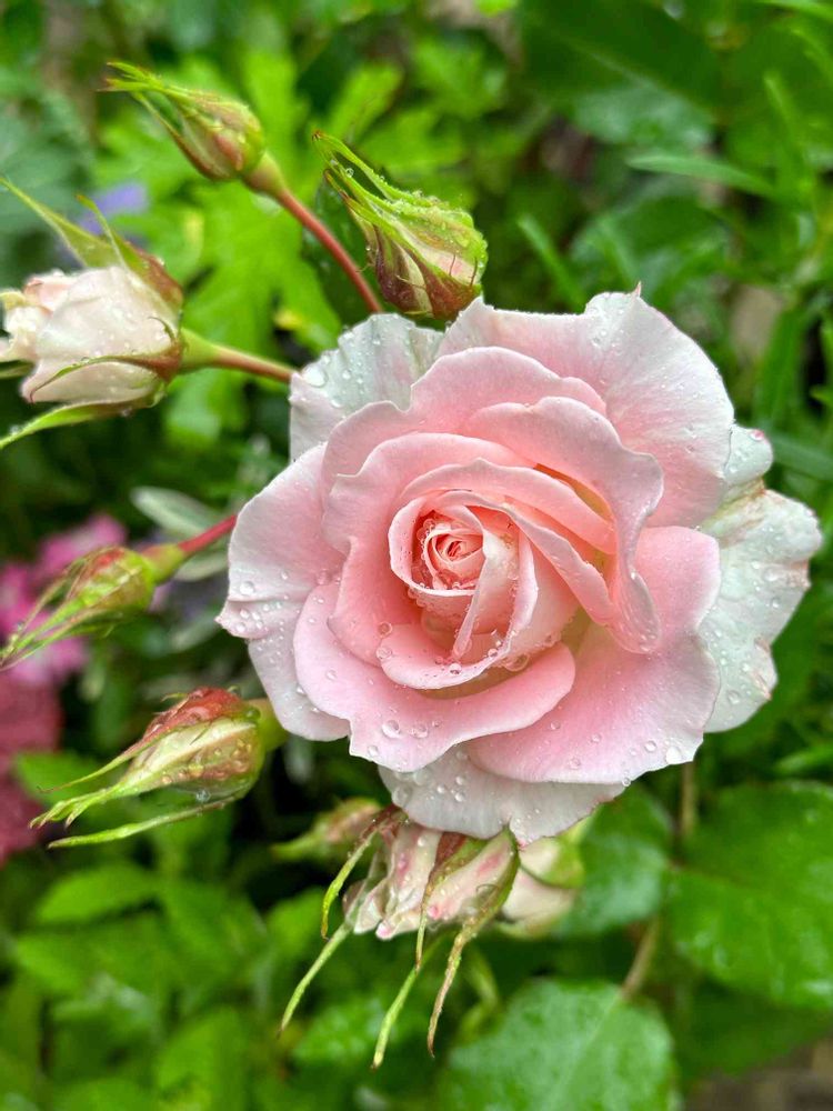 控えめなピンクの花弁にちょっとだけ濃いめの筋が不規則に入ります。