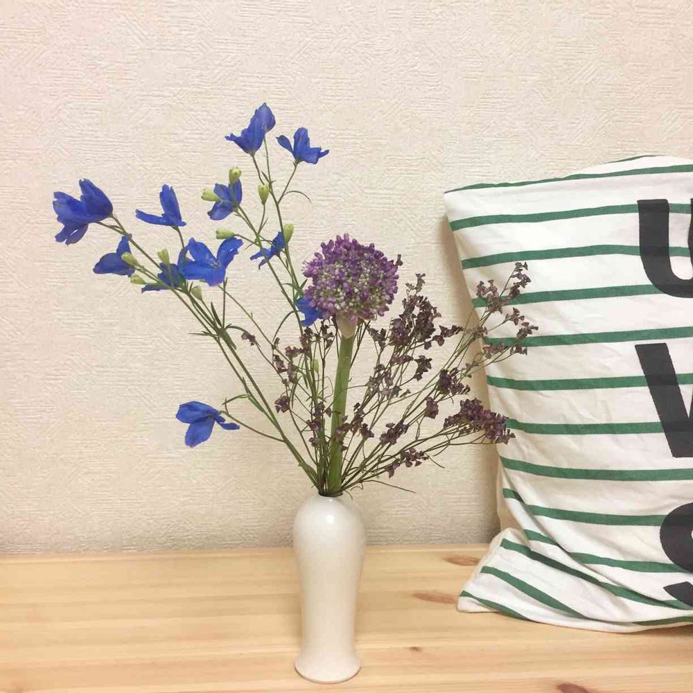 先日のスターチスがドライになってずっと飾っていたのですが、お花を足してみました。偶然だったのですがギガンジュームとスターチスは両方とも自分の誕生花❗️そして青いお花の名前は不明です。