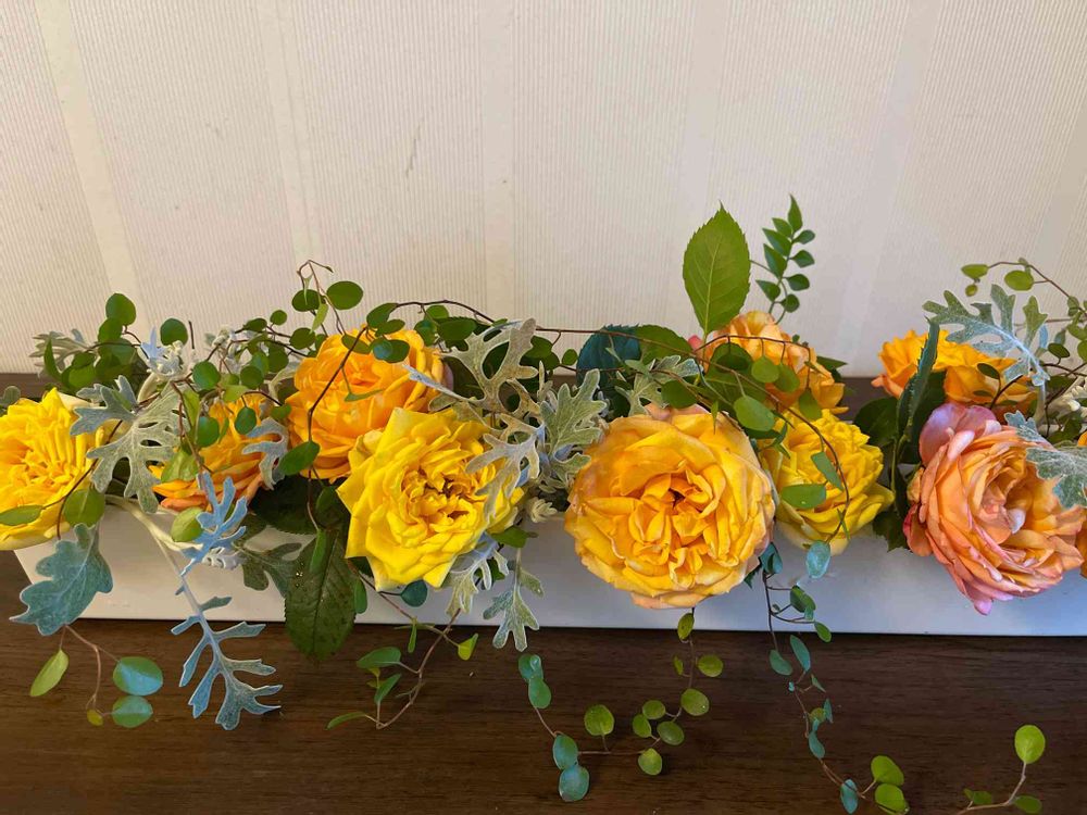 満開になった、黄色のミニバラとベビーロマンティカと,お庭のワイヤープランツ、シロタエギクで、アレンジ